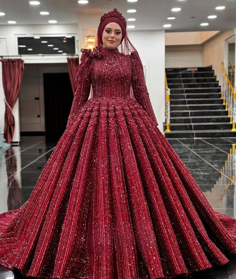 Bordo renkli, uzun kollu ve yüksek yakalı kadın abiye. Drape detaylı, desenli ve parlak kumaşıyla klasik şıklık sunar, düğünler için uygundur.