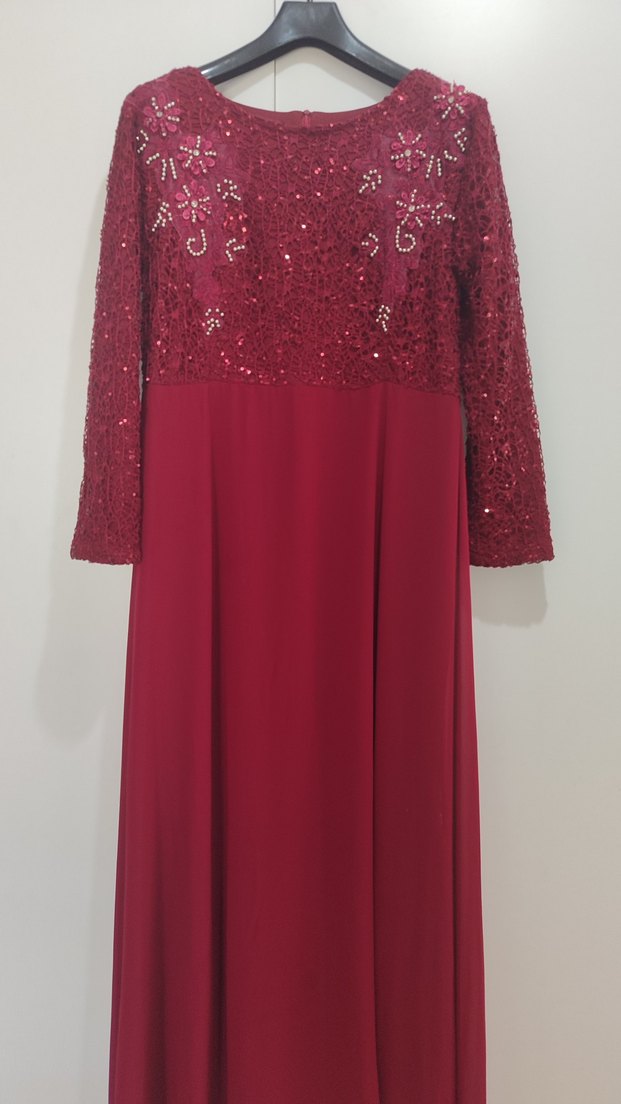 Bordo uzun kollu, yuvarlak yakalı abiye elbise. Üst kısmı nakışlı ve payetli, bol kesim ile şık ve parlak bir görünüm sunar. ✨