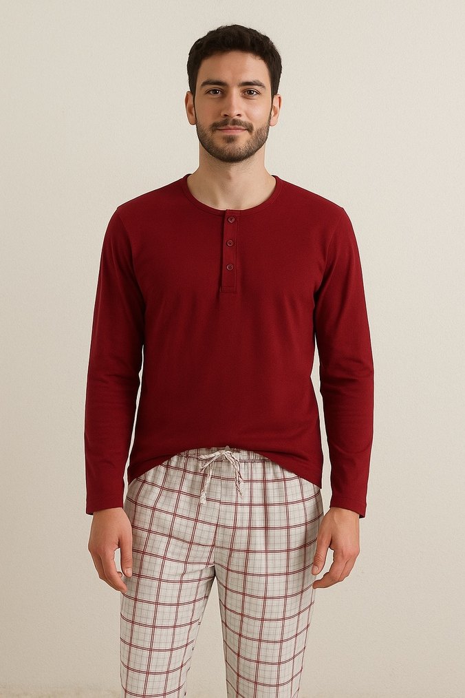 Bordo uzun kollu üst ve gri ekose desenli şortlardan oluşan kadın pijama takımı, rahat ve konforlu bir kullanım sunar.