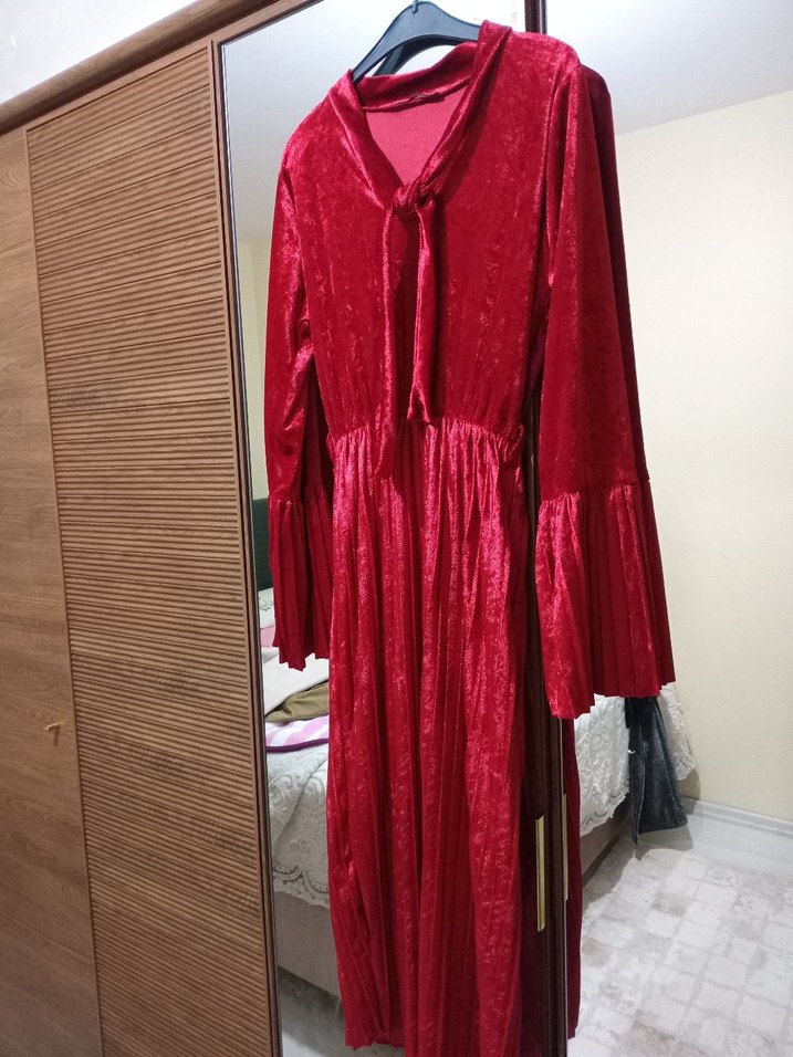 Bordo renkli, piliseli, uzun kollu, V yakalı ve bol kesim kadın elbisesi. Parlak dokusu ve bohem tarzıyla dikkat çeker. Etek boyu diz altina gelir. kadife elbisedir. dolabimdaki yesil kadifeden biraz daha hafiftir. aldim ama hiç giymedim.. ölçüleri için yaziniz. Xl beden ama kalıbı dardir
