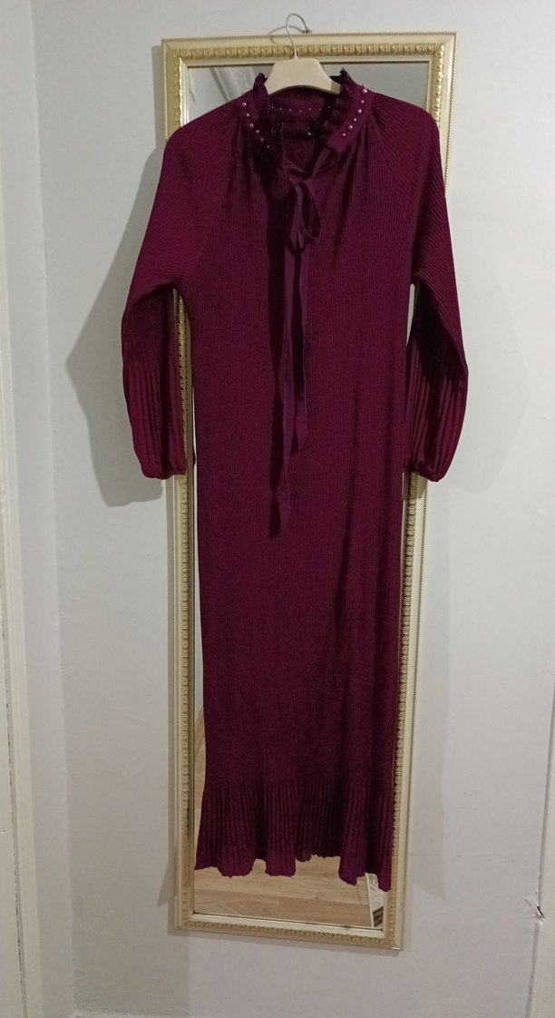 Bordo uzun kollu elbise, yüksek yakalı ve piliseli detaylara sahiptir. Yumuşak sentetik kumaştan üretilmiş, rahat bol kesim ve modern klasik tarz sunar. Günlük kullanım için uygundur.