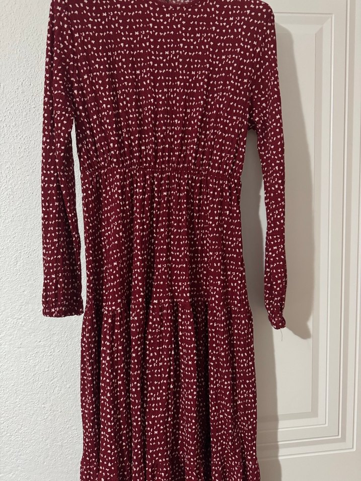 Bordo, uzun kollu, piliseli ve bol kesim kadın elbisesi. Bisiklet yaka ve koyu tonlarda batik desenlidir, bohem tarzı için uygundur.