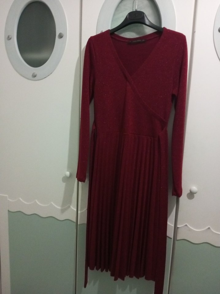 Bordo renkli uzun elbise, piliseli etek ve uzun kollu, yuvarlak yaka detayına sahiptir. Yumuşak triko kumaştan olup, bol kesim ve parlak görünüme sahiptir.