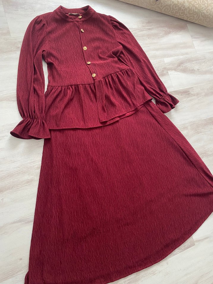 Bordo renkli, yüksek yakalı ve piliseli detaylara sahip uzun elbise. Yumuşak keten kumaştan, uzun kollu ve bol kesim vintage bohem tarzında, ofis kullanımı için uygundur.