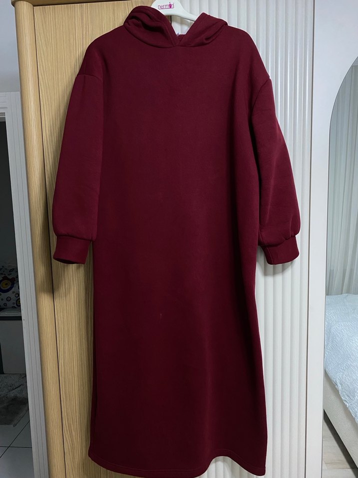 Bordo renginde, uzun kollu ve kapüşonlu, rahat kesim kadın elbisesi. Sokak stiline uygun, sade ve konforlu bir tasarıma sahiptir. Bir kaç kere giyildi defosuz