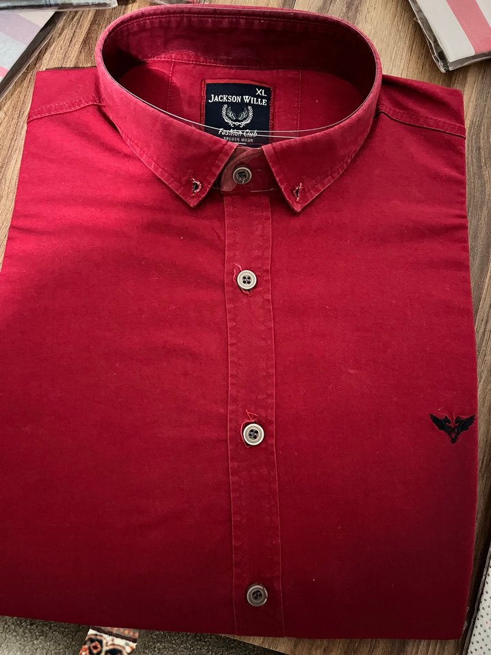 Bordo renkli, düğmeli, regular fit erkek gömlek. Pamuklu kumaştan