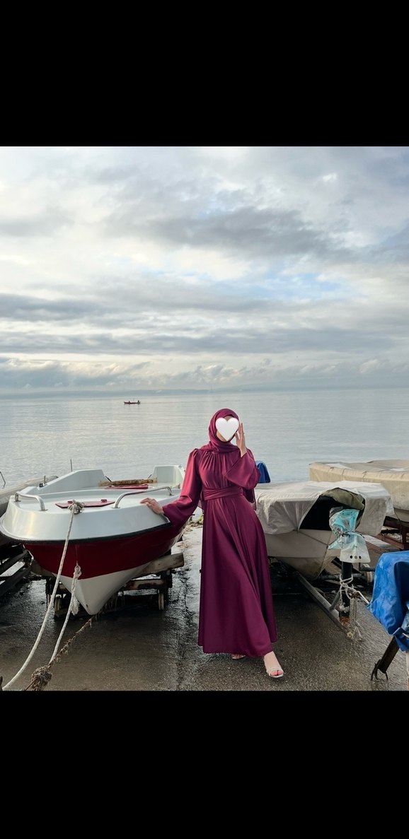 Bordo renkli, yüksek yakalı ve uzun kollu, salaş kesimli tasarıma sahiptir. Saten kumaştan üretilmiş, içi göstermeyen tarzdadır. Şalı da mevcuttur.