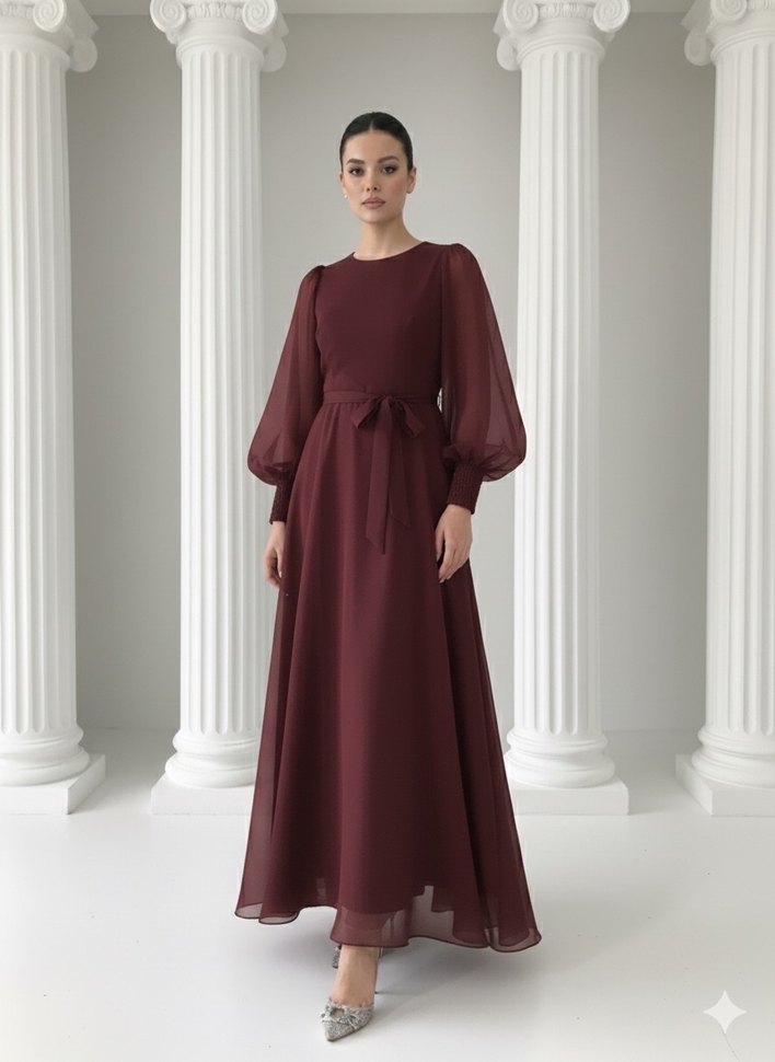 Bordo Uzun Kollu Salaş Abiye Elbise