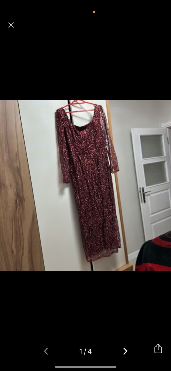 Bordo renginde, uzun kollu, salaş kesim bohem tarzda bir gece elbisesidir. Drapeli kumaşı ve bağlama desenleriyle vintage bir görünüm sunar, parti için uygundur.