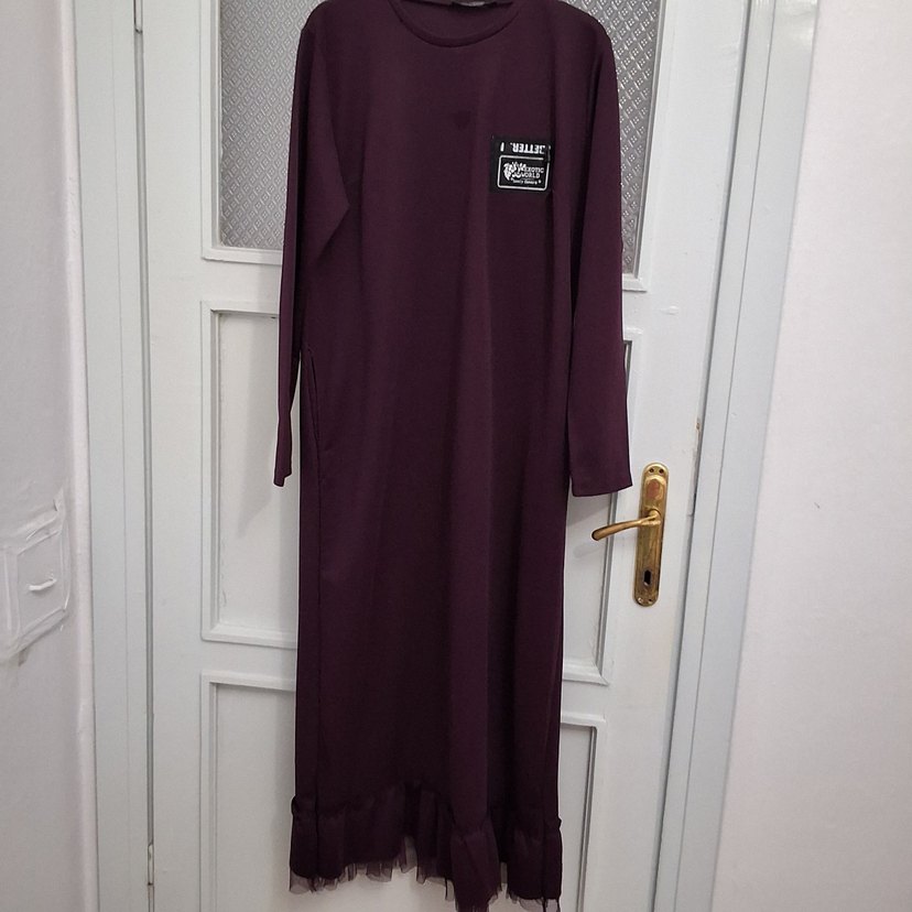 Bordo renkte, uzun kollu, salaş kesim uzun elbise. Sentetik kumaştan, bisiklet yaka ve baskılı cepli, alt kısmında yırtmaç detaylı.