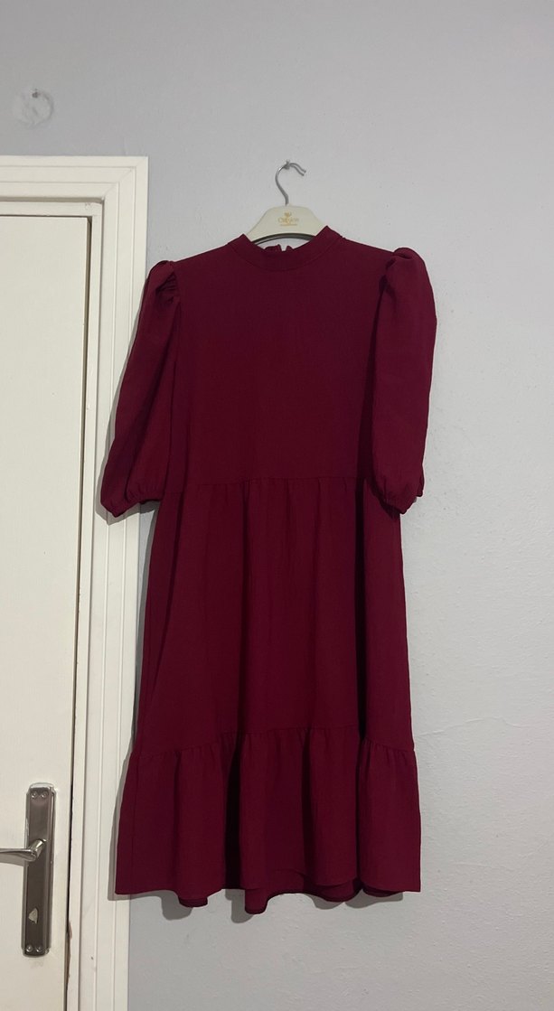 Bordo renkli, salaş kesim uzun elbise, fırfır detaylı ve yuvarlak yakalıdır. Yumuşak sentetik kumaştan yapılmış, uzun kollu ve bohem tarzda günlük kullanıma uygundur.