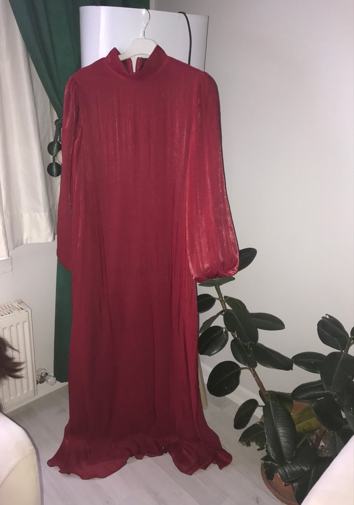 Bordo renkli, yüksek yakalı ve uzun kollu bu uzun elbise, ipeksi kumaştan, salaş kesim ve 1 kere giyildi kilo aldığım için olmuyo