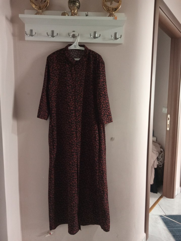 Bordo renkte, salaş kesimli, yakalı ve dökümlü uzun elbise. Yumuşak sentetik kumaştan, hafif batik desenli, günlük kullanıma uygun bohem ve retro tarzda. kolu dirsek üstü bileek ustu terzilik var yanlarda ek yailmistir geniş olsun diye