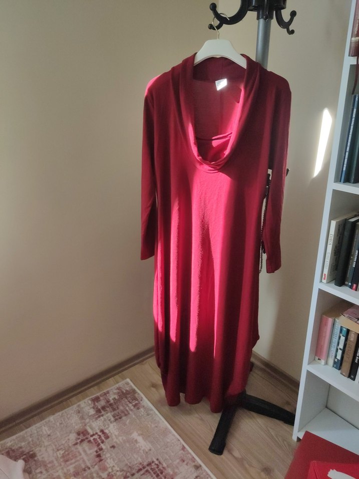 Bordo renkli, satenimsi kumaştan uzun ve salaş kesim elbise. Uzun kollu, drapeli V yaka ve desen içermeyen sade tasarıma sahiptir.