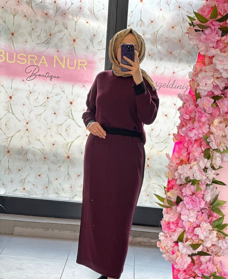 Bordo renkli, uzun kollu ve salaş kesim uzun elbise. İpek gibi kumaştan, sade ve rahat bir görünüm sunar. Günlük kullanıma uygundur.