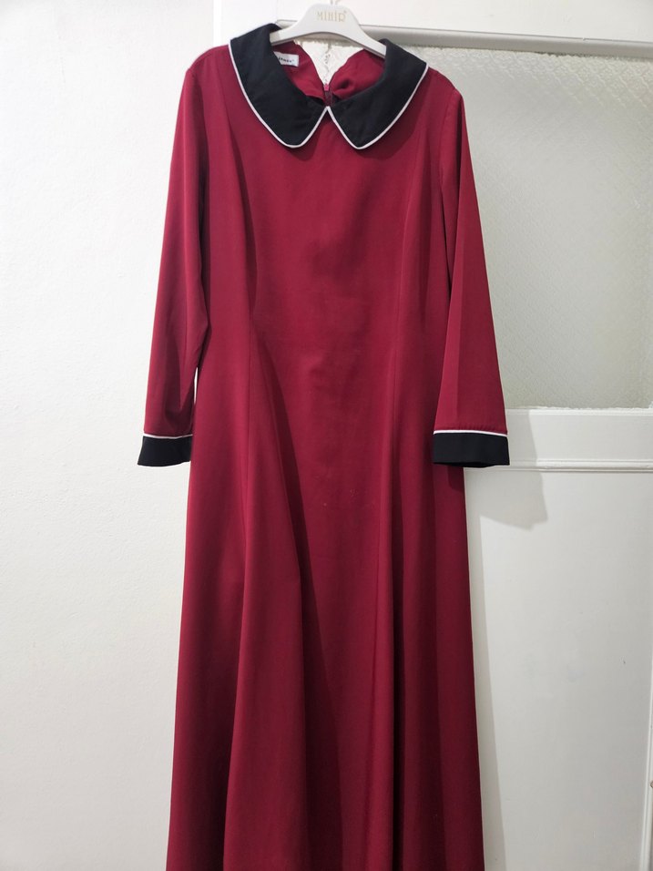 Bordo renkte, uzun kollu, salaş kesim elbise. Yumuşak ve sıcak kumaştan, yakalı ve drapeli klasik tarzda günlük kullanım için uygun.