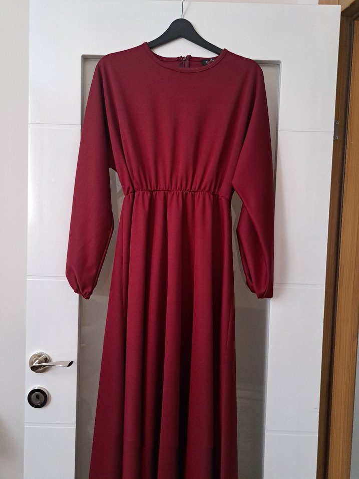 Bordo renkli uzun, salaş kesim elbise, beli lastikli. Yuvarlak yaka ve uzun kolludur. Yumuşak kumaştan üretilmiştir, sade ve modern klasik tarz sunar. boy 130 cm. etek kısmında küçük bir delik var.