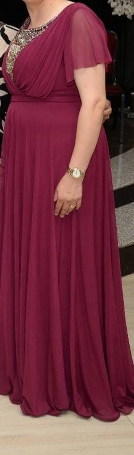 Bordo renkte, salaş kesim ve drapeli uzun abiye elbise. Kayık yaka ve kolsuz, parlak dokulu, desensiz kumaştan yapılmıştır. Düğün için klasik ve gösterişli tarzda.