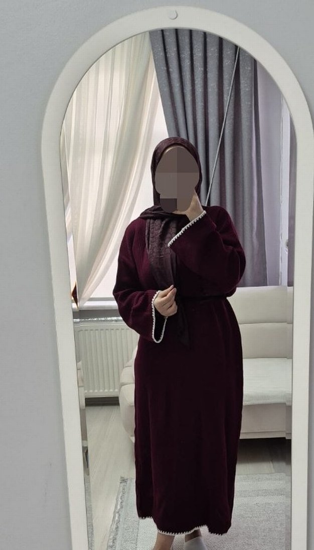 Bordo uzun, salaş kesim kadın elbise, drapeli detaylı, yüksek yakalı ve uzun kolludur. Yumuşak sentetik kumaştan üretilmiştir, günlük kullanıma uygundur.