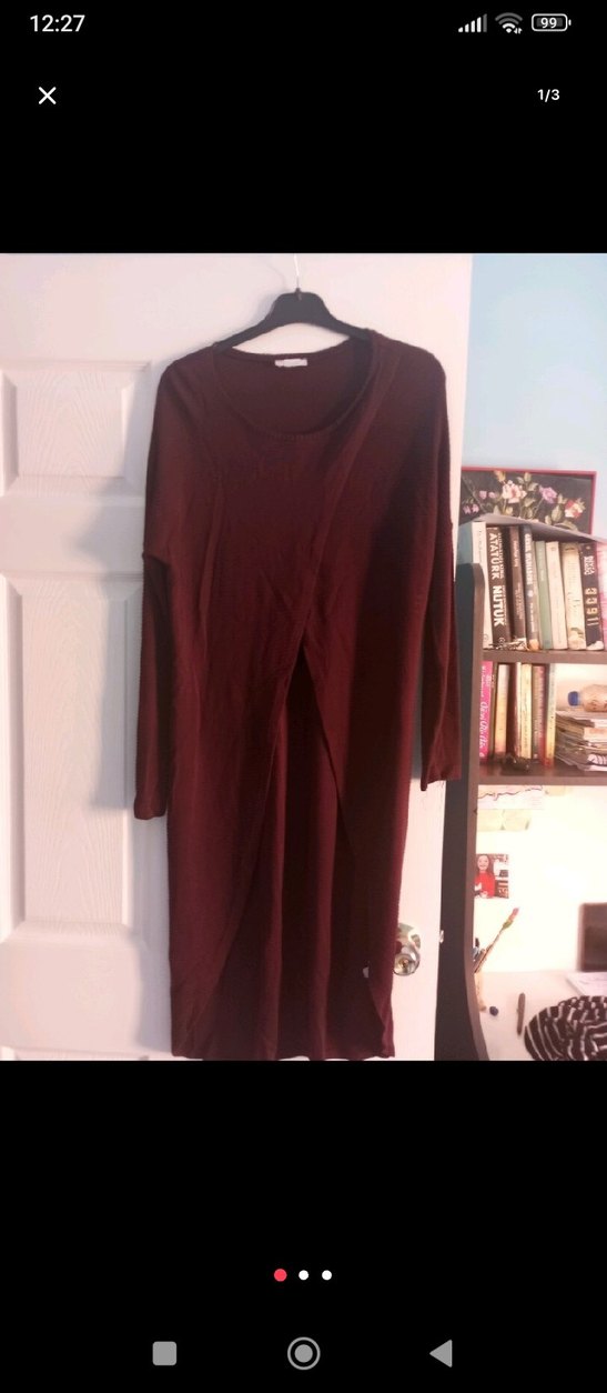 Bordo renkli, uzun kollu ve salaş kesimli bu kadın elbisesi, crew yaka ve drapeli tasarıma sahiptir. İpeksi kumaştan üretilmiştir, günlük kullanım için uygundur.