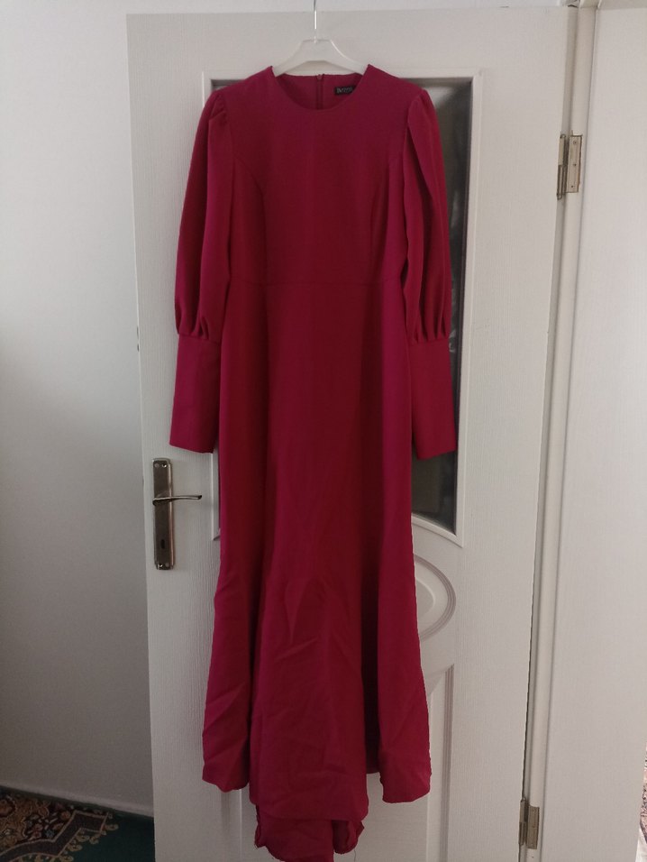 Bordo renkli, uzun kollu, salaş kesim ve drapeli detaylara sahip, satenimsi kumaştan yapılmış kadın elbisesi. Minimalist ve modern klasik tarzda, düğünler için uygundur.