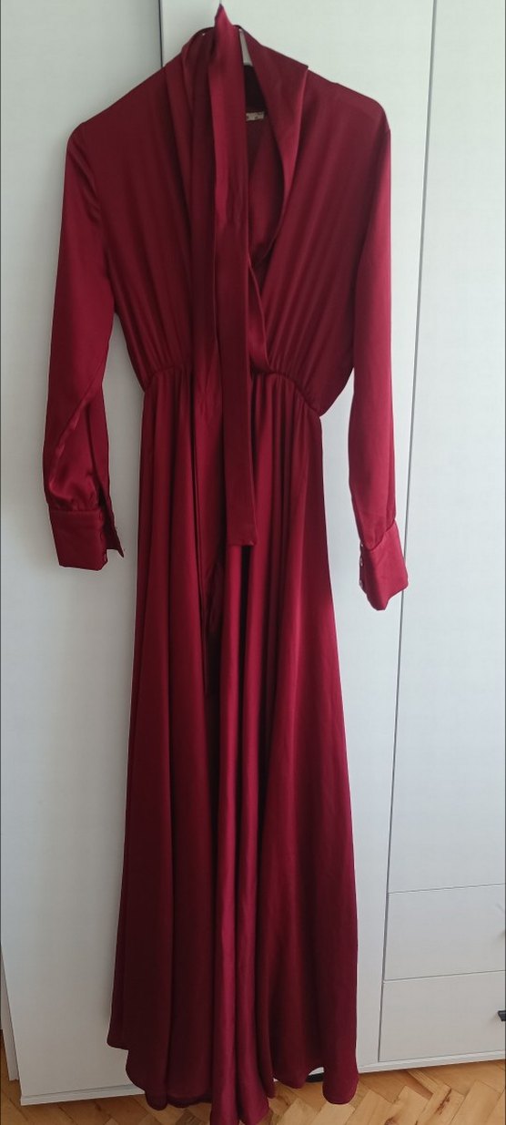 Bordo uzun elbise, ipeksi kumaş ve drapeli tasarıma sahiptir. V yakalı, uzun kollu ve salaş kesimdir. Romantik akşamlar için uygundur. Modern klasik tarzda, desensizdir. ❤️