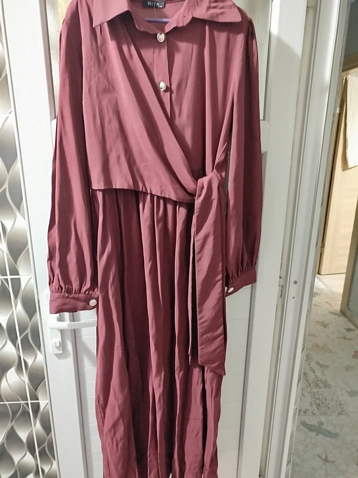 Bordo renkli, uzun kollu, salaş kesim ve dökümlü tasarıma sahip ipeksi kumaş elbisedir. Minimalist tarz için uygundur. rengi ışıktan dolayı soluk duruyo rengi koyu bordo kumaşı asla terketmez
