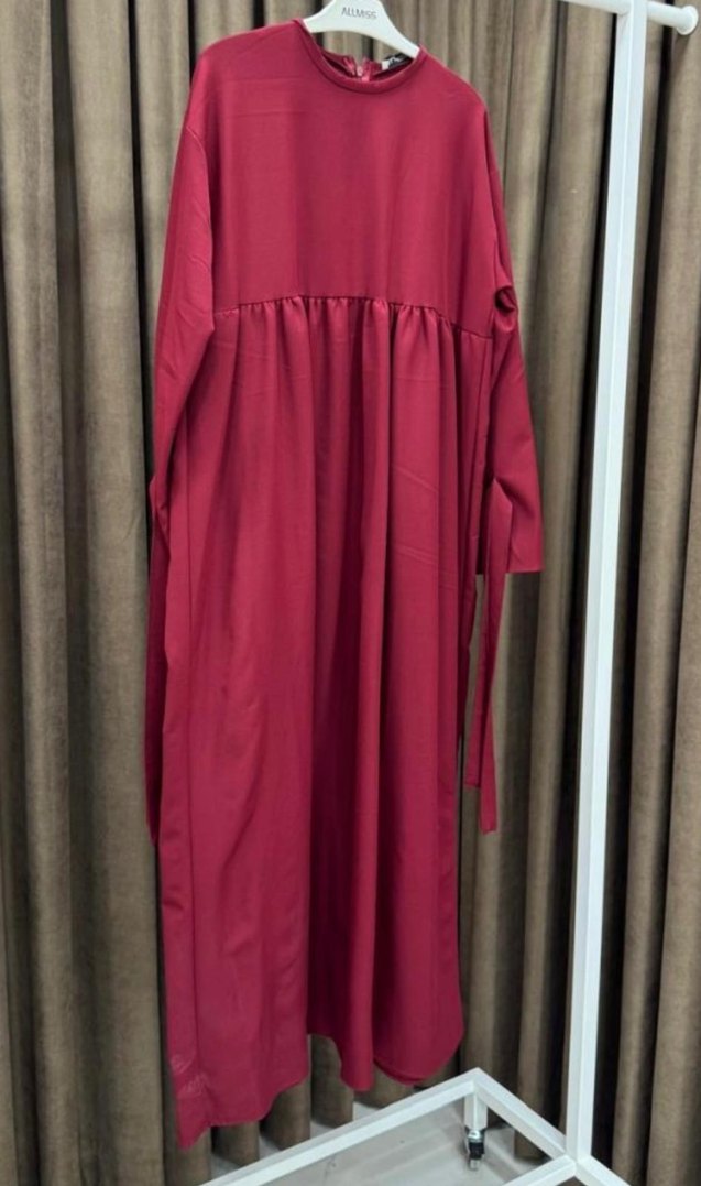 Bordo renkte, salaş kesim ve drapeli detaylara sahip uzun elbise. Sentetik kumaştan, uzun kollu ve tek renk. Minimalist ve bohem tarzda, günlük kullanıma uygun. 38 40 bedene uygundur