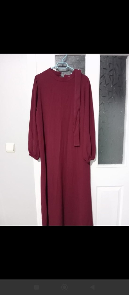 Bordo renkte, uzun kollu ve yüksek yakalı salaş kesim kadın elbisesi. Drapeli detayı ve yumuşak sentetik kumaşıyla sade, mütevazı ve bohem tarz sunar.
