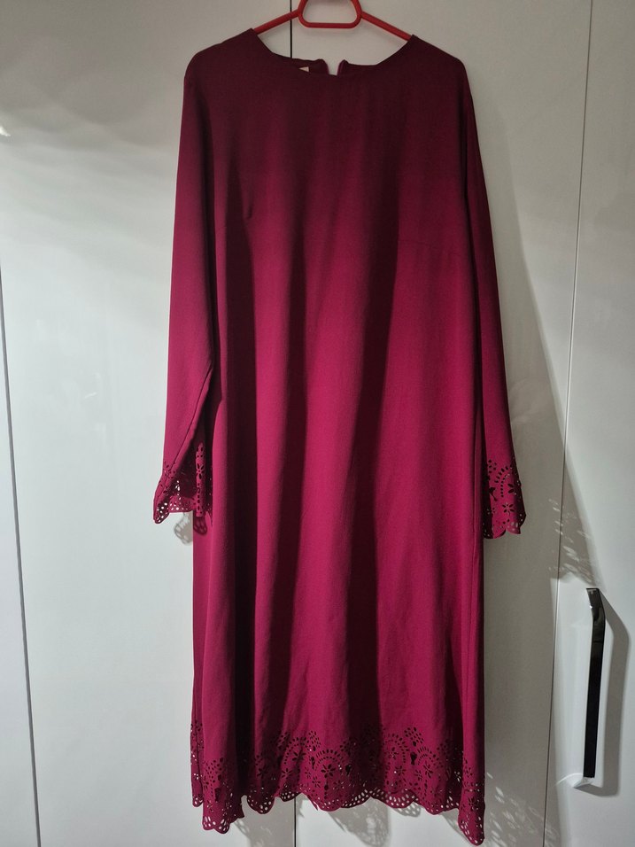 Bordo renkli, uzun kollu ve salaş kesimli bu elbise/tunik drapeli detaylara ve lazer kesim kenarlara sahiptir. Minimalist ve sade tarzda bir elbisedir.