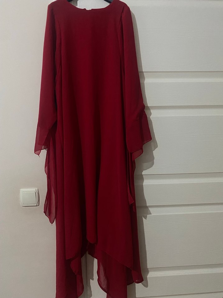Bordo renkli, uzun kollu ve salaş kesimli kadın elbisesi. İpek dokulu kumaştan, drapeli ve minimal tasarımlı, düğünler için uygun.