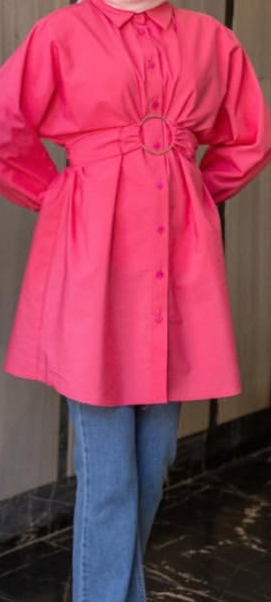pembe renkli, etnik desenli, sentetik kumaştan uzun kollu, salaş kesim, yüksek yakalı ve drapeli kadın tunik. yukarıdaki resmin pembesi aynı model renk farklı