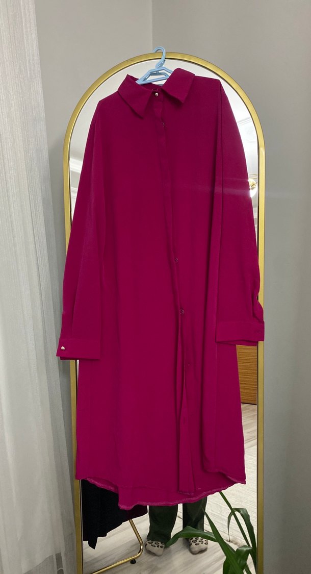 Bordo renkte, yakalı ve uzun kollu, salaş kesimli, dökümlü ve ipeksi kumaştan yapılmış uzun tunik. Ofis için uygun, sade ve şık.