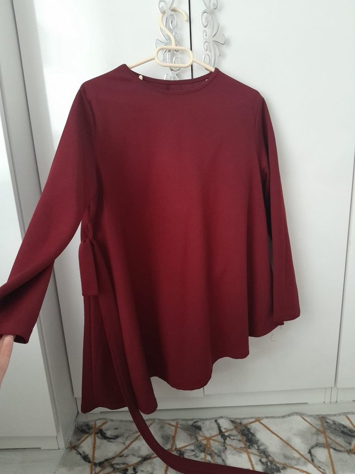 Bordo renkli, yuvarlak yakalı ve uzun kollu kadın tunik. Salaş kesim ve dökümlü tasarıma sahip, yumuşak ve sıcak kumaştan midi boyda. Günlük kullanıma uygun minimal stil.
