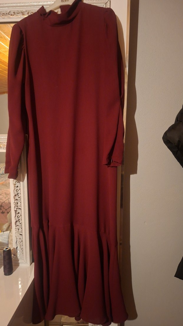 Bordo renkte, salaş kesim ve drapeli detaylara sahip uzun elbise. Yüksek yakalı, uzun kollu ve bohem tarzda, ofis için uygun. Sentetik kumaştan üretilmiştir.