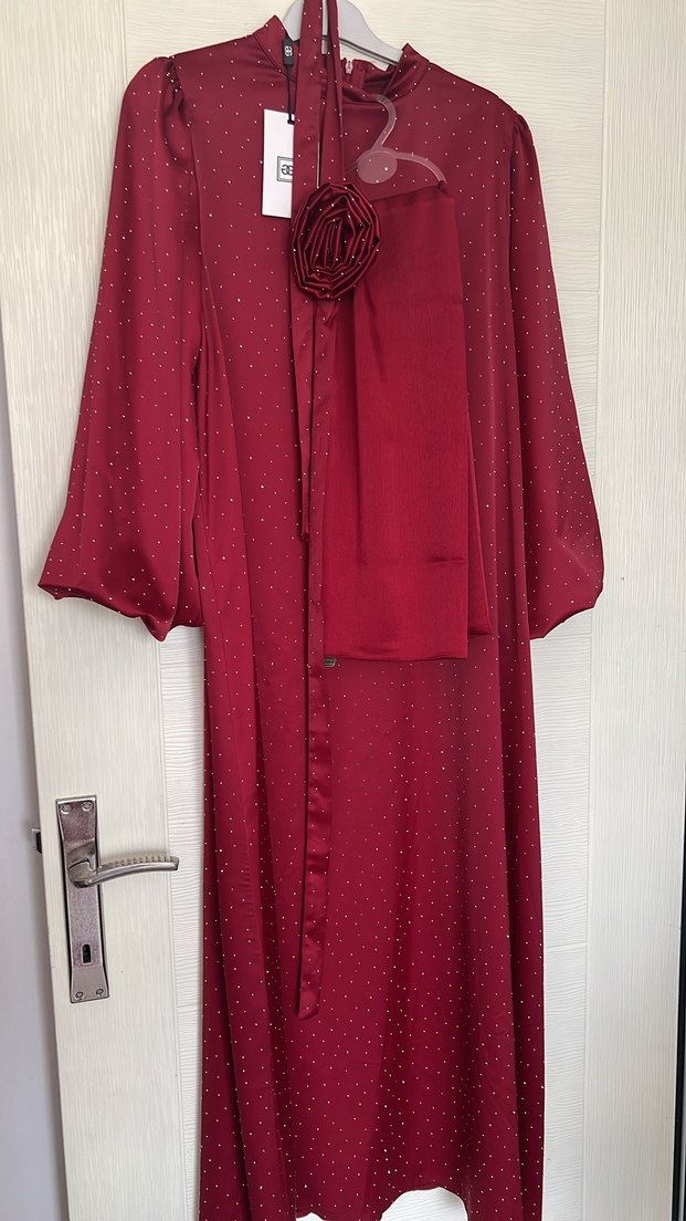 Bordo uzun elbise, parlak saten kumaş, dökümlü ve bol kesim. Notlu yaka ve uzun kollu, romantik akşamlar için uygun. Sımlerınde hafız dökülme var bırkere gıyıldı şal dahıl degıldır