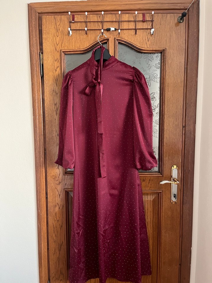 Bordo parlak saten kumaştan, uzun kollu, yüksek yakalı, drapeli vintage tarzda klasik bohem elbise, romantik akşamlar için ideal şalı ile beraber satilmaktadır