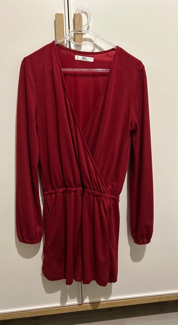 Bordo renkte, V yakalı, uzun kollu ve mini boyda, yumuşak sentetik kumaştan yapılmış, bohem ve retro esintili dar kesim tulum. Romantik akşamlar için uygundur. Sorunsuz.