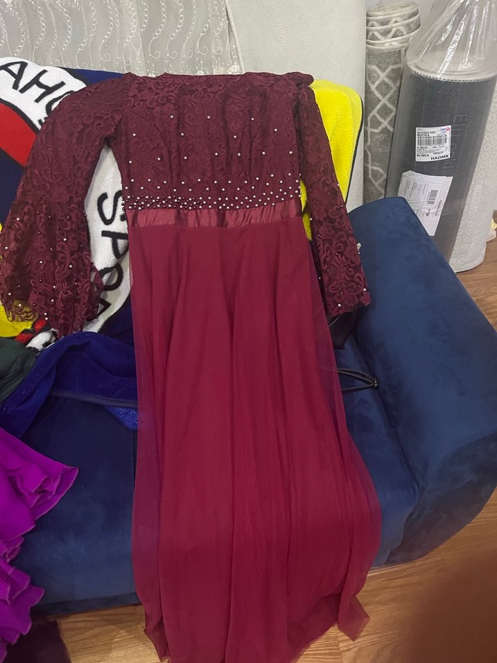 Bu koyu bordo uzun elbise, drapeli detaylara sahip . Uzun dantel kollu ve yakalı, bohem düğünler için uygundur.
