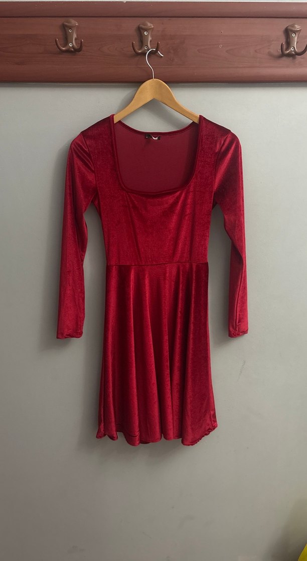 Bordo süet kumaştan, uzun kollu ve V yakalı, drapeli, minimalist gotik tarzda, romantik akşamlar için uygun, vücuda oturan midi elbise.