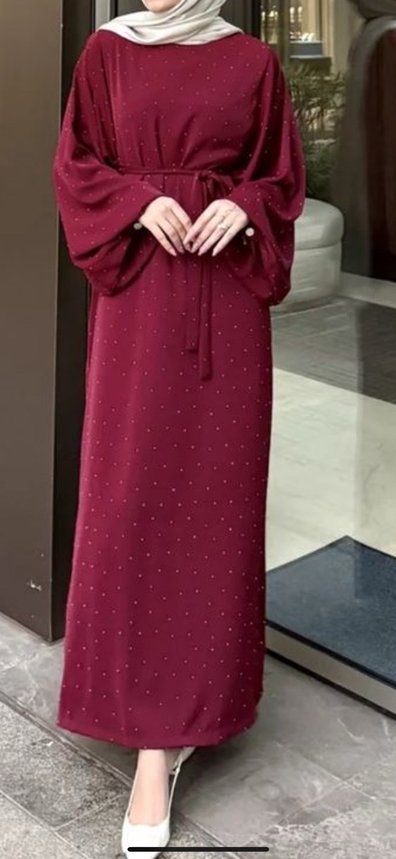 Bordo renk, uzun kollu, V yakalı, bol kesim, drapeli ve taşlı uzun elbise Melike Tatardan 36 38 40 bedene uyumlu