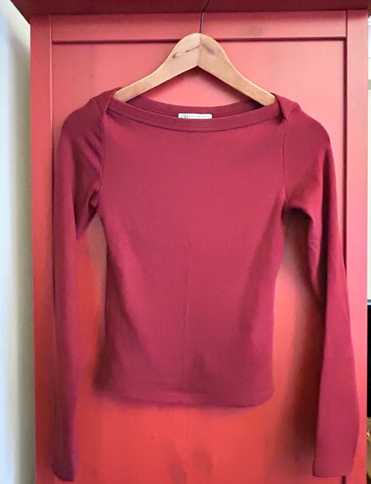 Bordo renginde, uzun kollu ve bisiklet yakalı, ince kesim hamile tişörtü. Sade ve desen içermeyen, ipeksi dokuda günlük kullanıma uygun bir model.