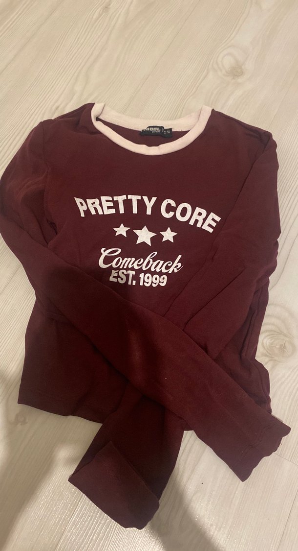 Bordo renkli, pamuk kumaştan yapılmış, uzun kollu ve fitted kesim tişört Üzerinde 'Pretty Core', 'Comeback' ve 'EST.1999' baskıları bulunur.