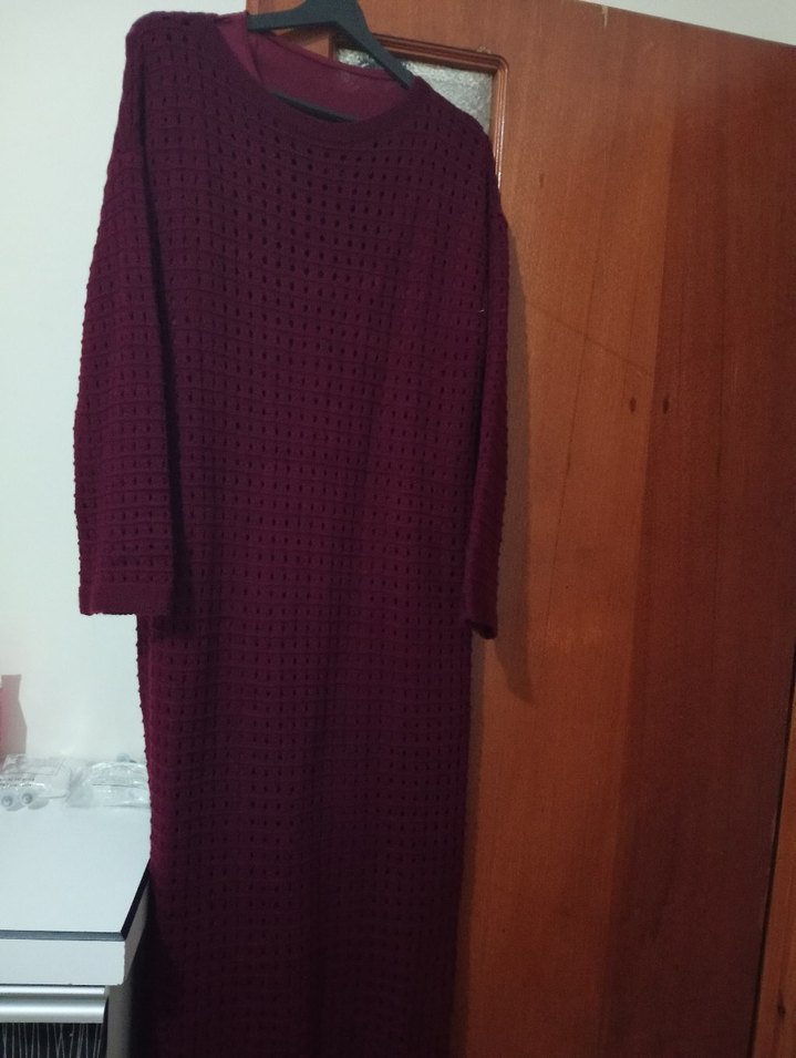 Bordo renkte, uzun kollu ve yuvarlak yakalı triko elbise. Rahat kesimi ve örgü dokusu ile günlük kullanıma uygun, sade ve konforlu bir modeldir.