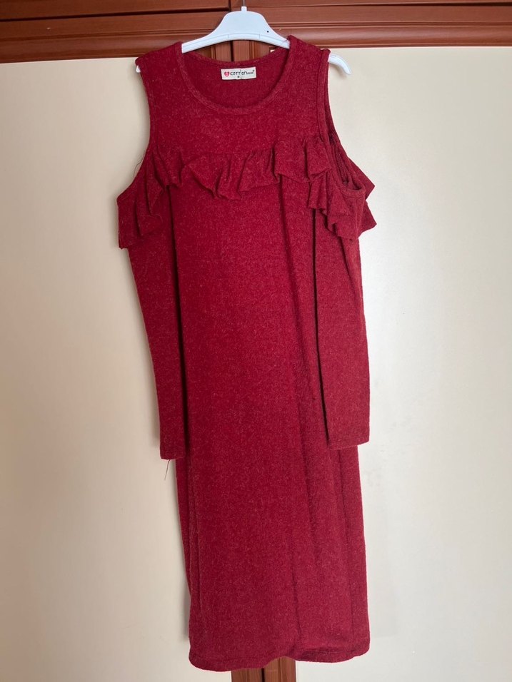 Omuz dekolteli yünlü gibi ama çok kalın değil esnek elbise. Boydan foto yok ama olduğum kadarıyla koydum. Vucuda oturan bi yapsısı var. Diger ğrğnlerimden alırsanız toplu alımda biraz daha indirim ıygularım Bordo renkli, uzun, bol kesim, kolsuz triko elbise. Yuvarlak yakalı ve fırfır detaylı, yumuşak ve sıcak kumaştan üretilmiştir. Rahat ve günlük kullanıma uygundur.