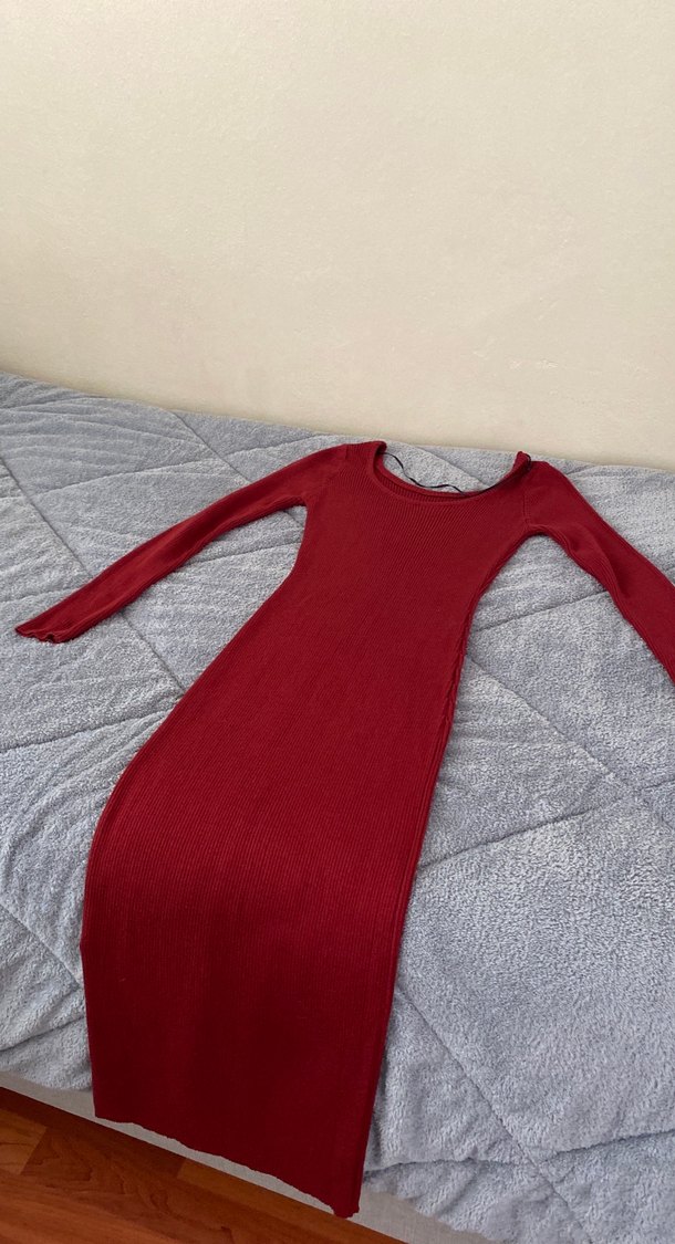 Bu bordo uzun elbise, uzun kollu ve kayık yaka detayına sahip. Yumuşak sentetik kumaştan örme dokusuyla günlük rahat kullanıma uygundur. Boyu 118 cm ‘dir.
