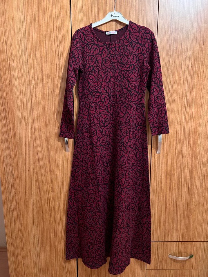 Bordo renkli, triko dokulu, uzun kollu ve bisiklet yaka uzun elbise. Rahat kesimi ve hafif batik deseniyle günlük kullanıma uygundur. 38-40 beden uyumludur.