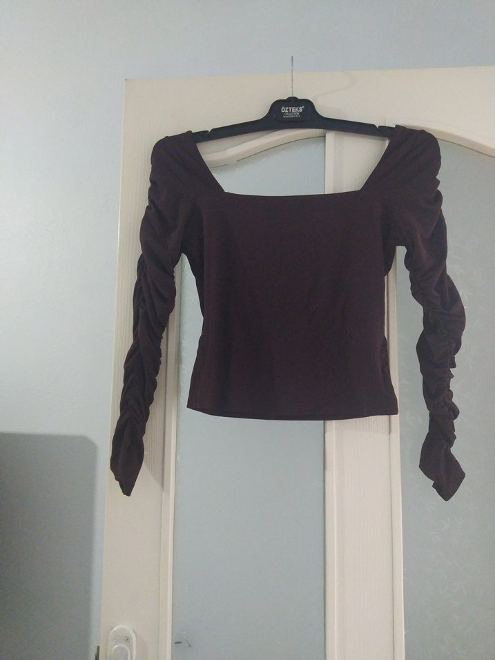 Bordo renkli, uzun kollu, büzgülü kolları ve kare yaka detayıyla triko kumaş kadın bluz. Günlük kullanıma uygun, gotik tarzda şık bir parça.