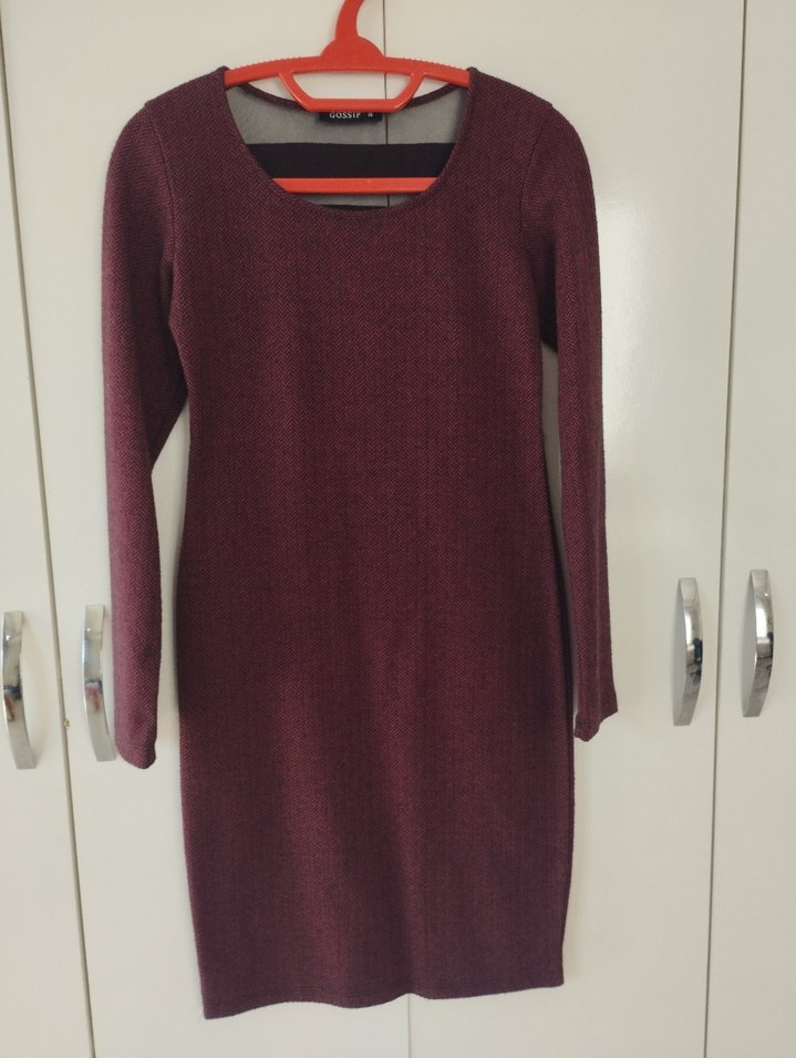 Bu bordo triko kadın elbise, uzun kollu ve yuvarlak yakalı, yumuşak örgü sentetik kumaştan yapılmıştır. Rahat ve modern klasik tarz için uygundur.