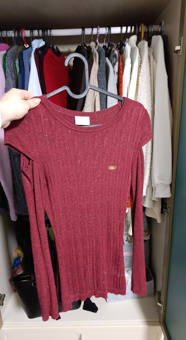 Bordo renkli, parlak görünümlü, uzun kollu ve bisiklet yaka, triko kumaştan yapılmış, vücuda oturan kadın kazak. Günlük ve sokak stili için uygundur.